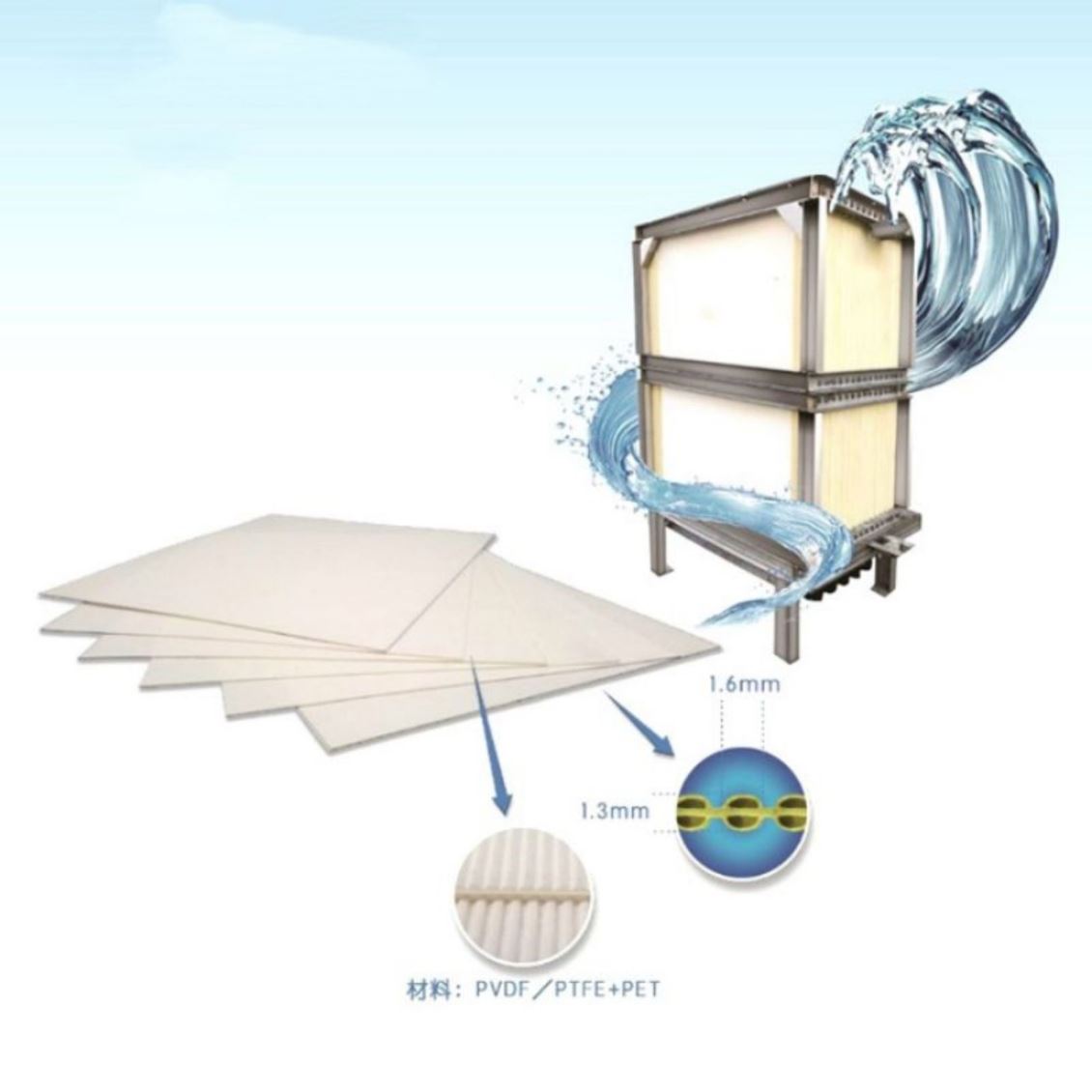 ①PVDF增强型MBR膜:不断丝,中空纤维超滤膜组件,适用于各种污水、废水;
